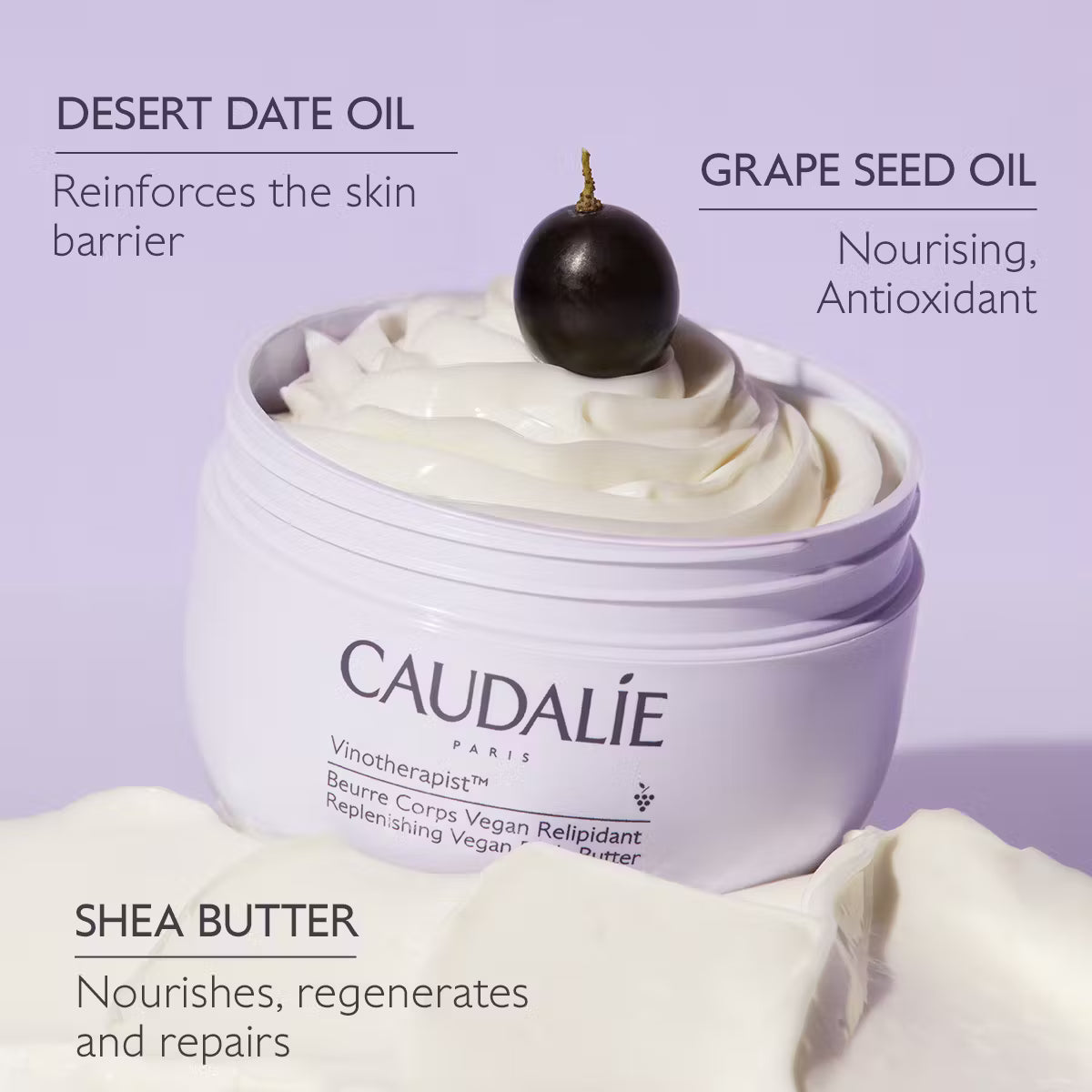 Caudalie - Vinotherapist™ Vegan Body Butter with Shea Butter is specially designed for dry to very dry skin that craves deep hydration and long-lasting comfort. Enriched with grape-seed oil, organic shea butter, and desert date oil, this rich balm-textured formula melts into the skin to deliver 24-hour intense nourishment. Its silky texture provides immediate relief from itching, tightness, and discomfort, while supporting skin repair and restoring suppleness. Even atopic-prone and sensitive skin feels calm, soft, and replenished.