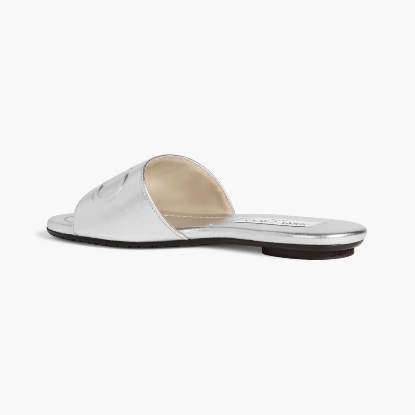 Elevate your off-duty look with the effortlessly chic JIMMY CHOO Tiaret Embossed Metallic Leather Slides in silver. Crafted in Spain, these slides feature a shimmering metallic finish and are beautifully embossed with the iconic Jimmy Choo logo for a luxurious touch. Designed with a sleek open round toe and set on a subtle heel, they offer a perfect blend of comfort and sophistication.
