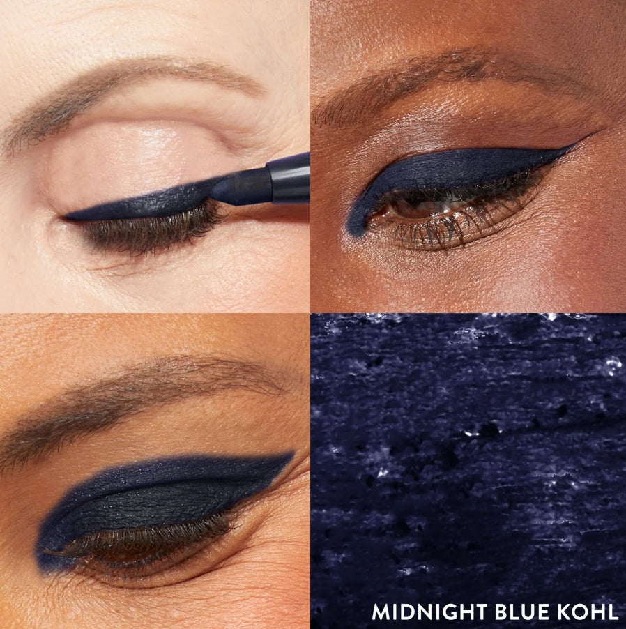 Midnight Blue Kohl: ISODODECANE, SYNTHETIC WAX, ETHYLENE/PROPYLENE COPOLYMER, POLYMETHYLSILSESQUIOXANE, SILICA, POLYBUTENE, HYDROGENATED POLYDICYCLOPENTADIENE, SUCROSE TETRASTEARATE TRIACETATE, COCO-CAPRYLATE/CAPRATE, ORYZA SATIVA (RICE) EXTRACT, MICA, SYNTHETIC BEESWAX, MALTODEXTRIN, HYDROGENATED CASTOR OIL, PENTAERYTHRITYL TETRA-DI-T-BUTYL HYDROXYHYDROCINNAMATE, CAFFEINE, TOCOPHEROL, HELIANTHUS ANNUUS (SUNFLOWER) SEED OIL, IRON OXIDES (CI 77491, CI 77499), ULTRAMARINES (CI 77007), TITANIUM DIOXIDE (CI 77891), FERRIC FERROCYANIDE (CI 77510), BLUE LAKE 1 (CI 42090), CARMINE (CI 75470).