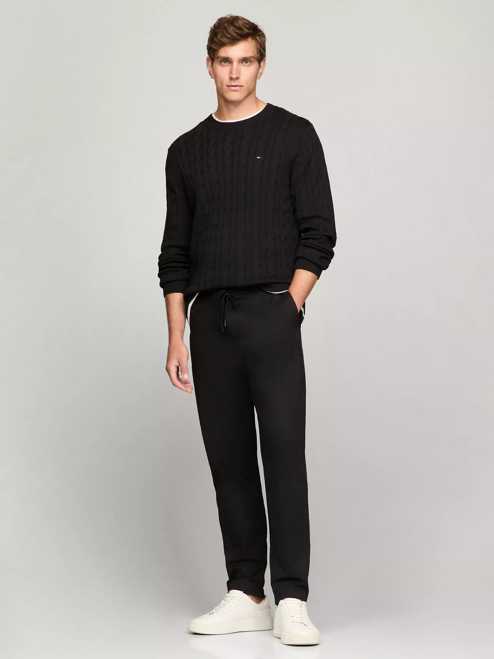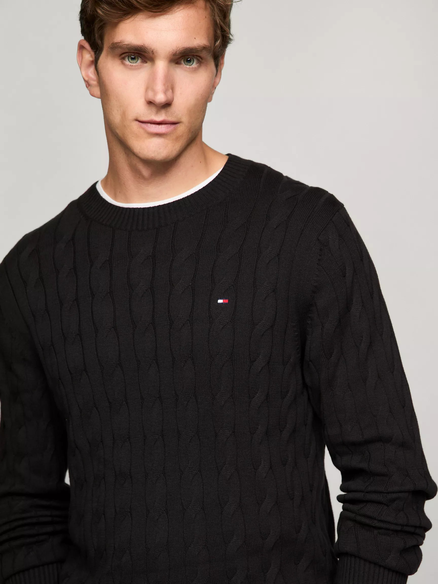 Tommy Hilfiger men's sweater. Made from soft cotton in a textured cable knit weave, this crewneck sweater is the perfect layer. It features rib-knit cuffs, collar, and hem and touches of subtle branding throughout.