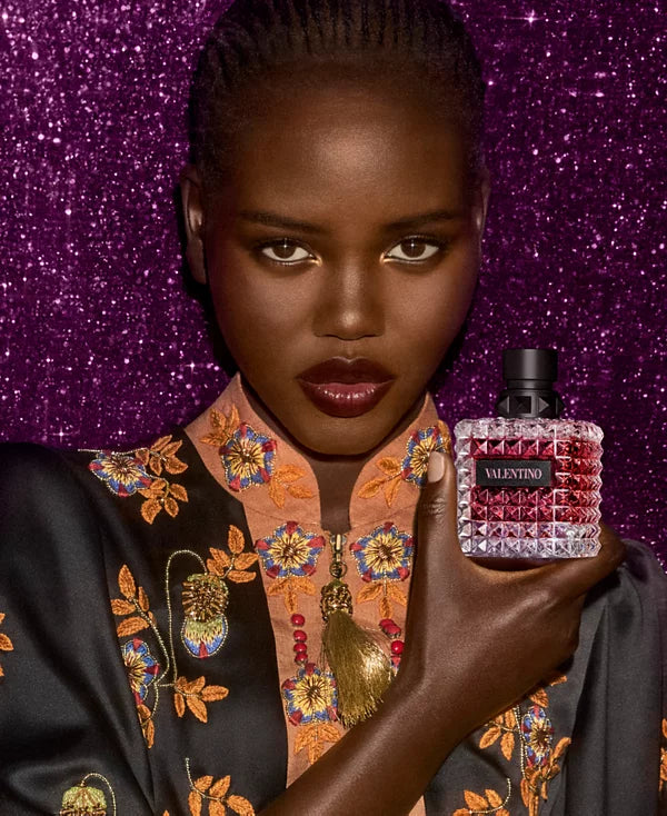 Embrace bold beauty and vibrant joy with this Valentino Donna Born in Roma Holiday gift set, wrapped in gold stars and finished with a festive bow. The iconic perfume bottle, inspired by Roman Rockstud design, stands out with its edgy pyramidal shape and striking black leather and vivid pink accents.